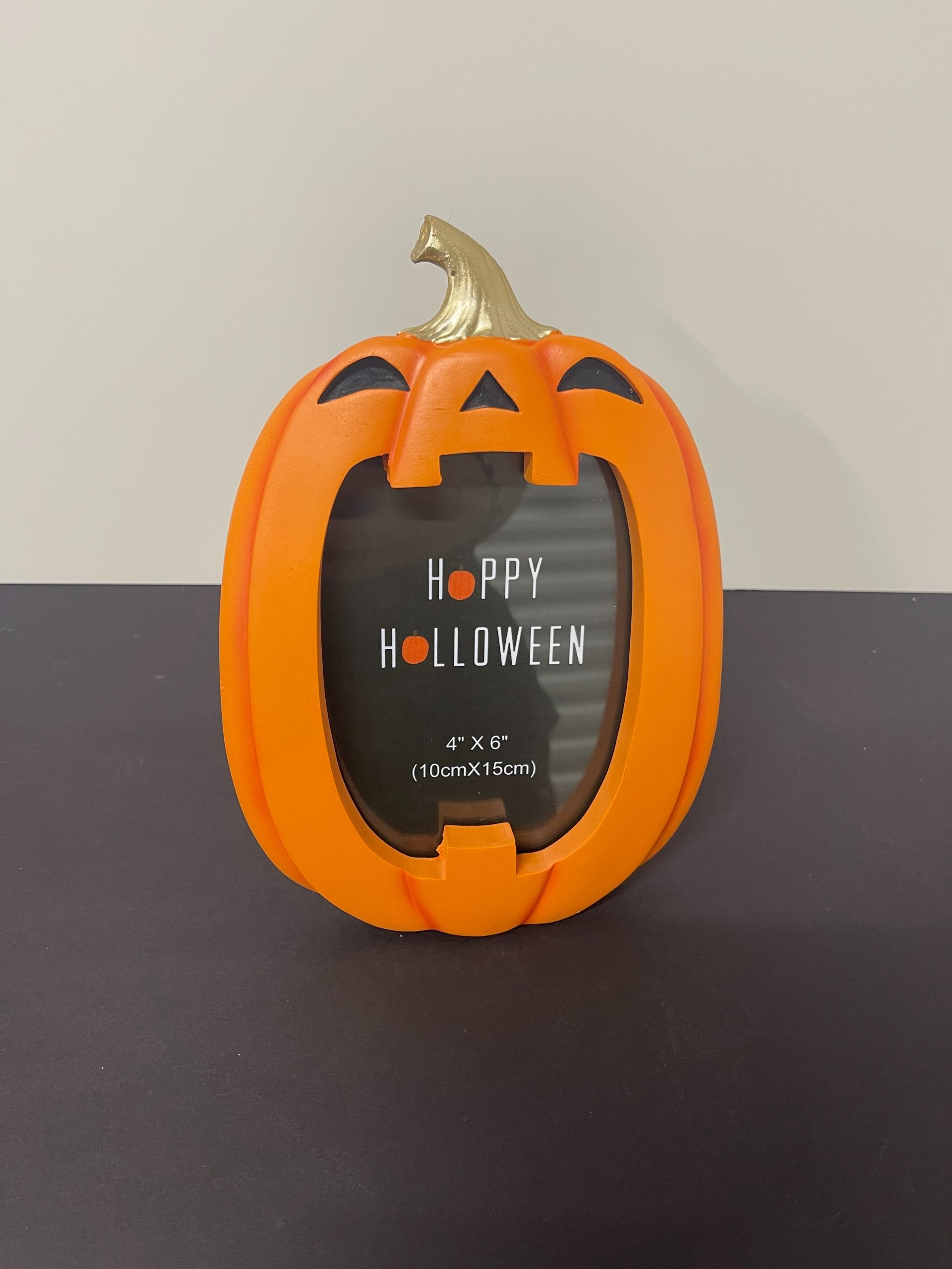Pumpkin-shaped Halloween photo frame with jack-o’-lantern face and “Happy Halloween” insert. Fits 4×6 photos. Brand new.