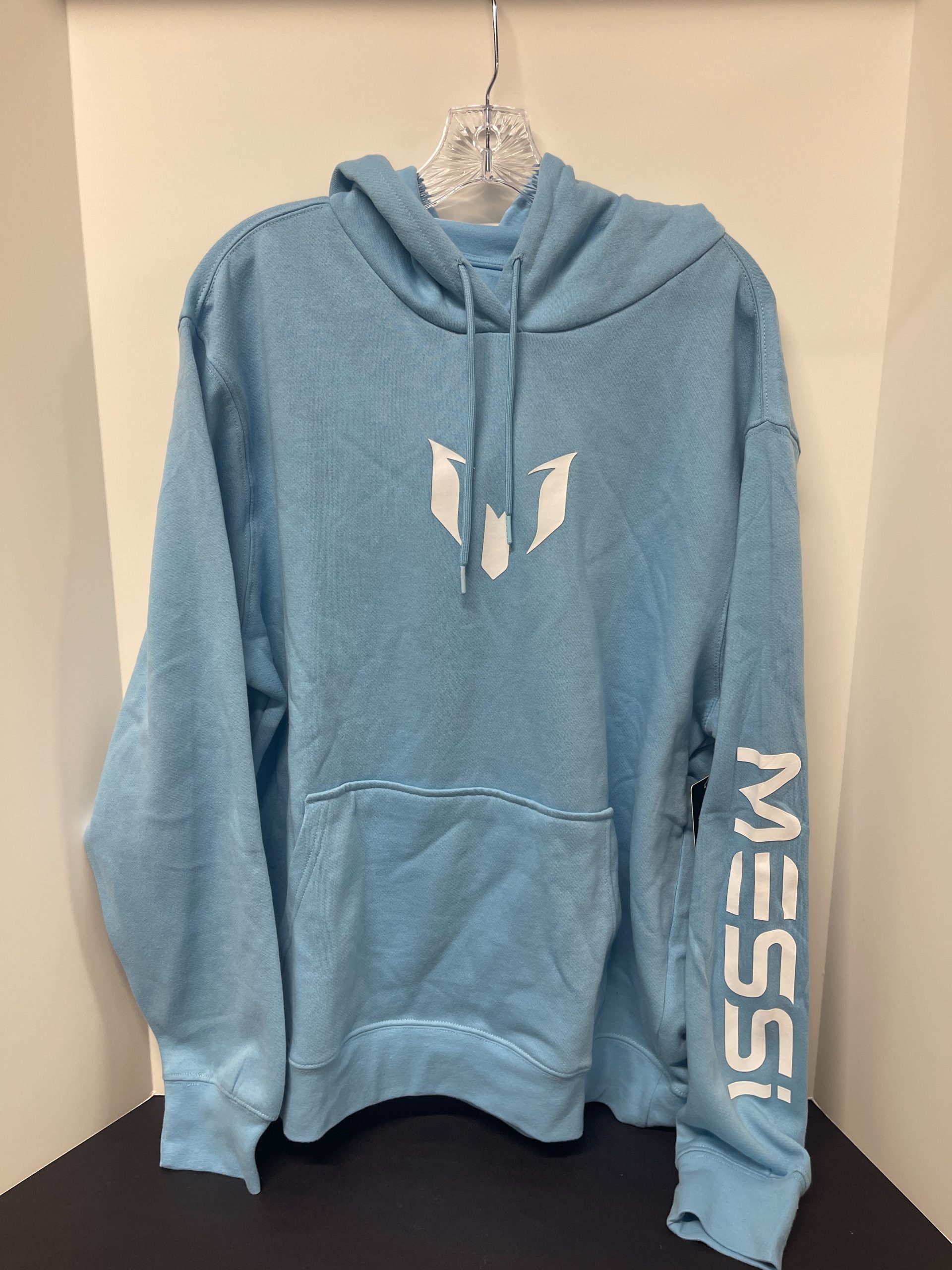 Light blue Messi hoodie in men’s size Large. Features stylized “M” logo on chest and bold sleeve print. Brand new with tags.